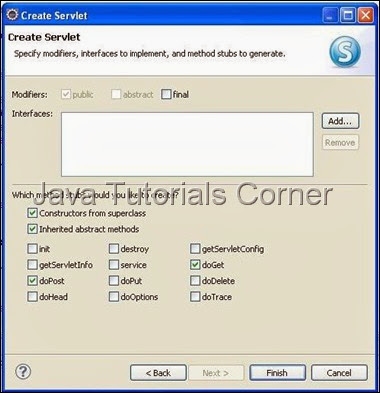 6. Click Next it will show methods available in HttpServlet. Select appropriate method you need.